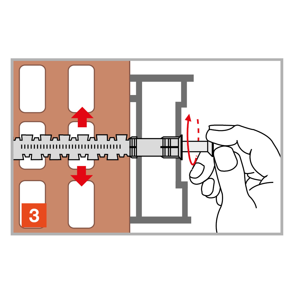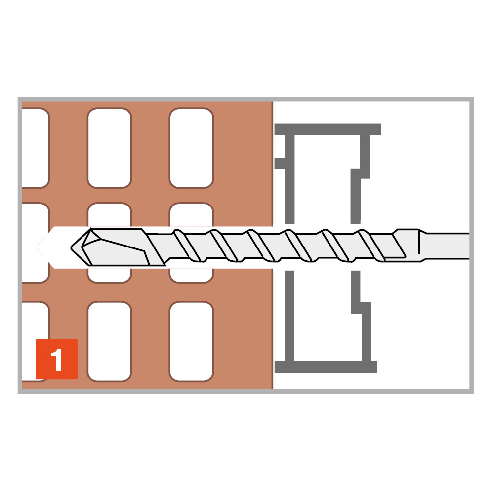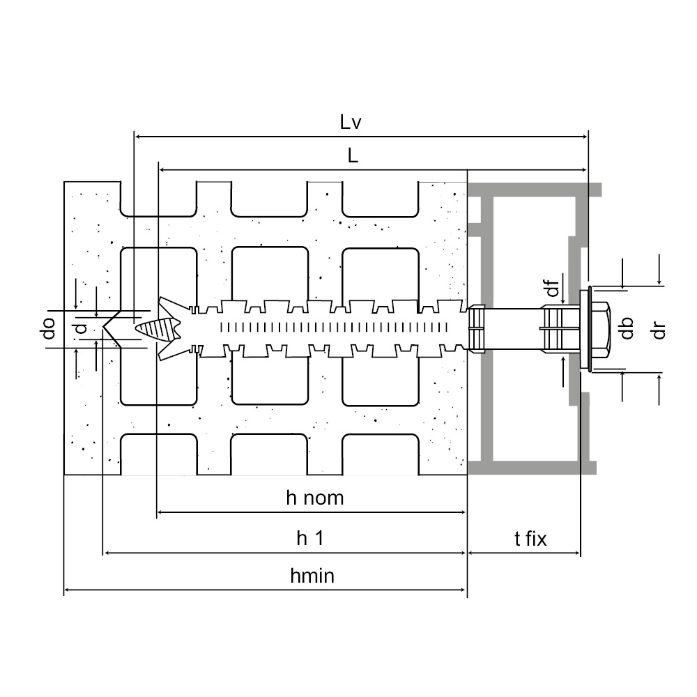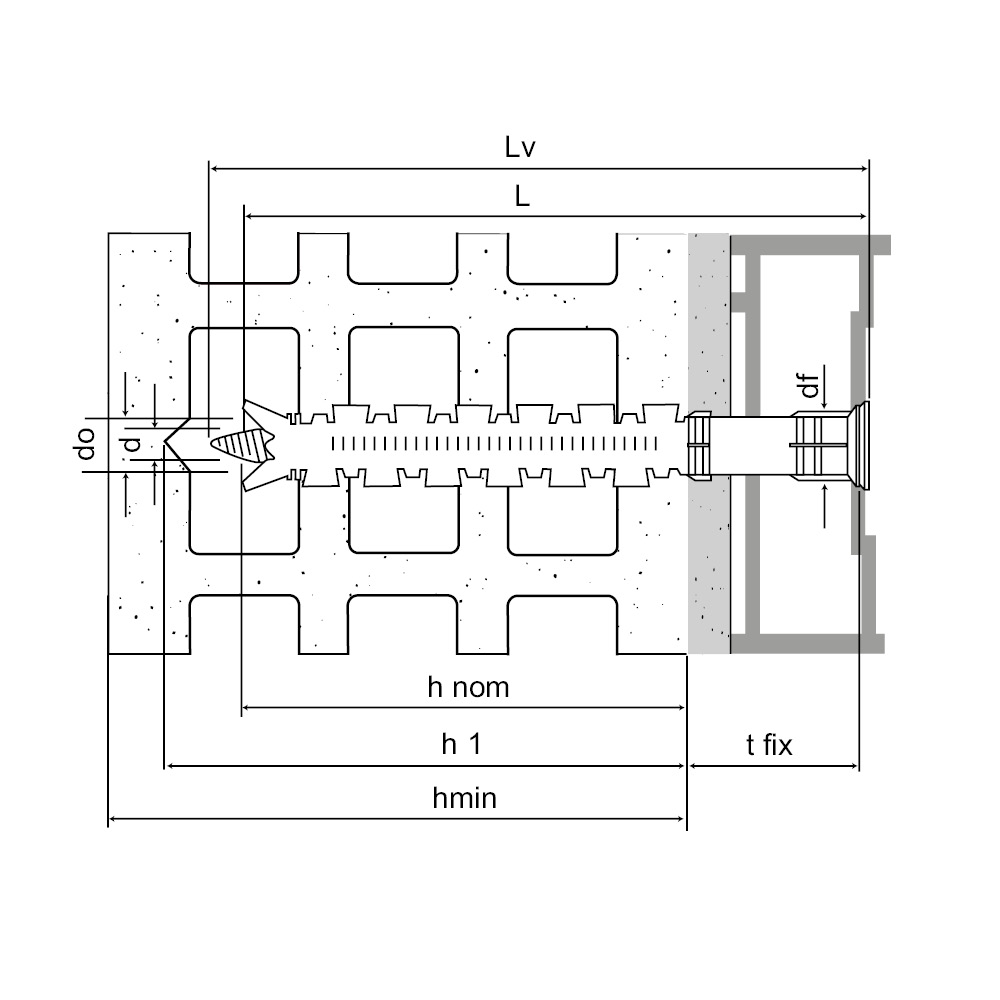 | Art. nr. | Product Reference | Hole diameter x anchor length [doxL] [mm] | Max. fixture thickness [tfix] [mm] | Min. hole depth [h1] | Nominal embedment depth [hnom] [mm] | Min. support thickness* [hmin] [mm] | Hole diameter in fixture [df] [mm] | Screw diameter [d] [mm] | Screw length [Lv] [mm] | Bit | Qty per box | Qty per outer box |