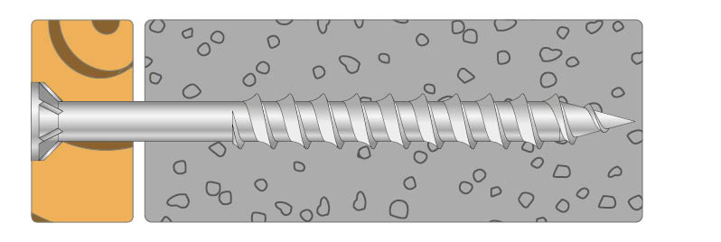 Fest skruen direkte i det porøse steinmaterialet uten forboring. Bruk en drill med lav rotasjonshastighet, men unngå å trekke til skruen for hardt. Om dette skulle skje, vil gjengene glippe i underlaget, og festepunktet må etableres på nytt. Minimumsforankring er 60 mm.