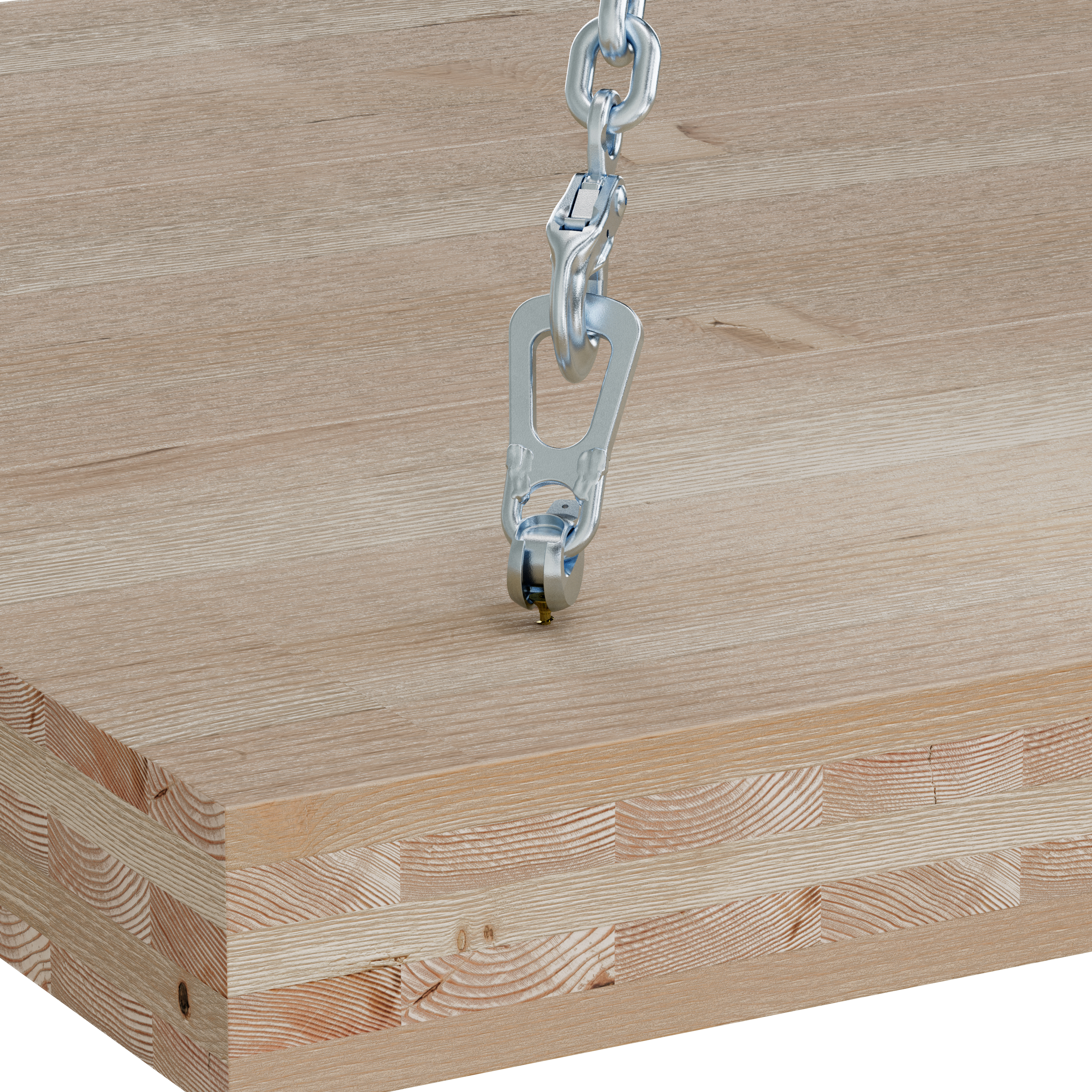 Løfteøye til massivtre som gir en rask og effektiv montering av treelementer og limtrebjelker. Løfteøyet monteres med en skrue i treet, noe som sparer tid under monterings prosessen. Demonteringen er også meget enkel. Øyet kan benyttes mange ganger. Det medfølger et eget verktøy for kontroll av slitasjen.