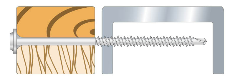Flenshodeskrue med montering mot stål inntil 3 mm. (Stålstenderverk). Høy-lav kombigjenger er også egnet til montering i trevirke.