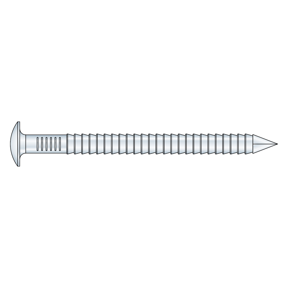 Rillet spiker med svakt koppet hode til montering av ulike materialer til tre, hvor det er behov for økt uttrekks kapsitet.