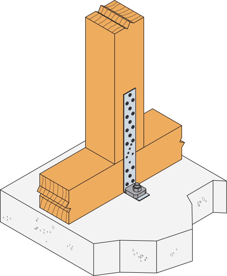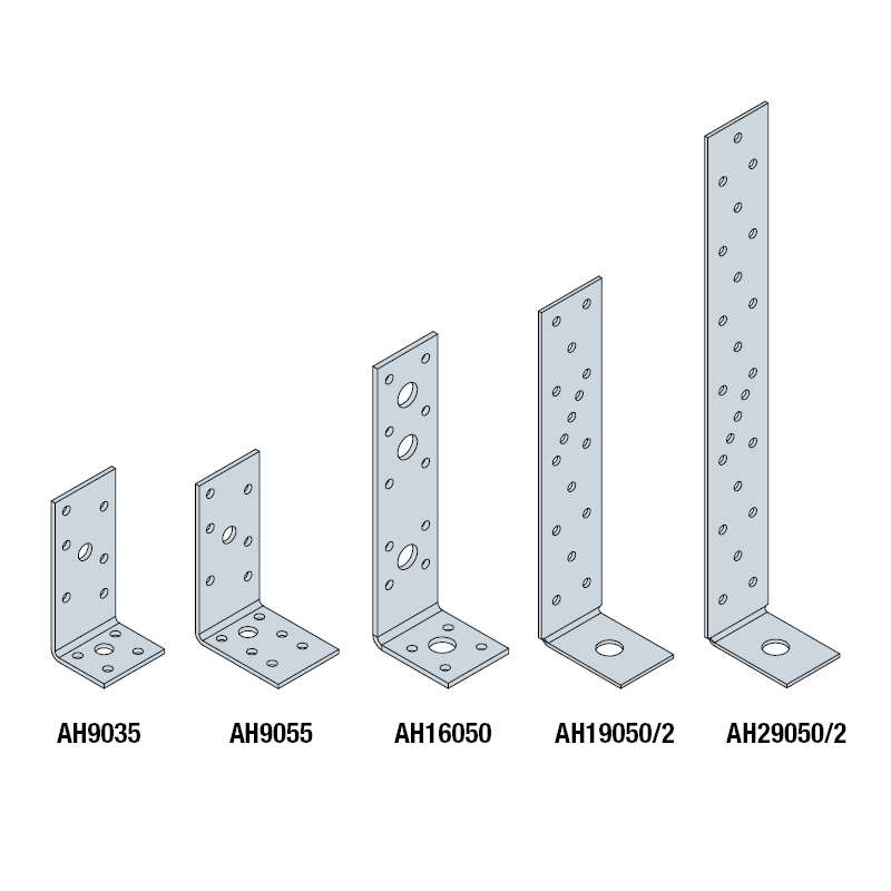 AH vinkelbeslag brukes ved tre-tre skjøter (AH9035 og AH16050) eller til skjøter mellom trebjelker/tresøyler og betong.