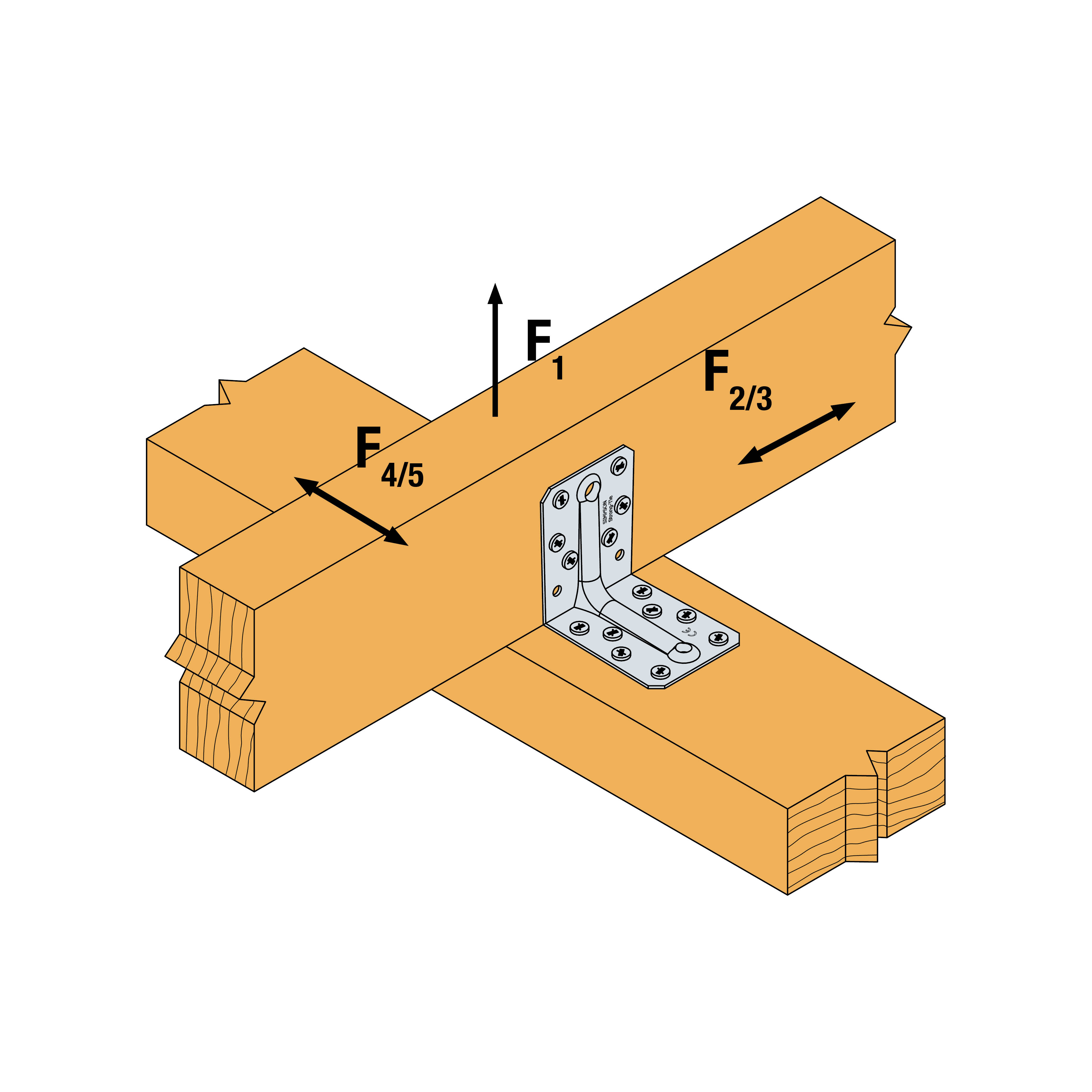 F4 Tverrgående kraft som virker i bjelkeretningen midt på vinkelbeslaget. Virker inn mot vinkelbeslaget i høyden (e) over bjelken.